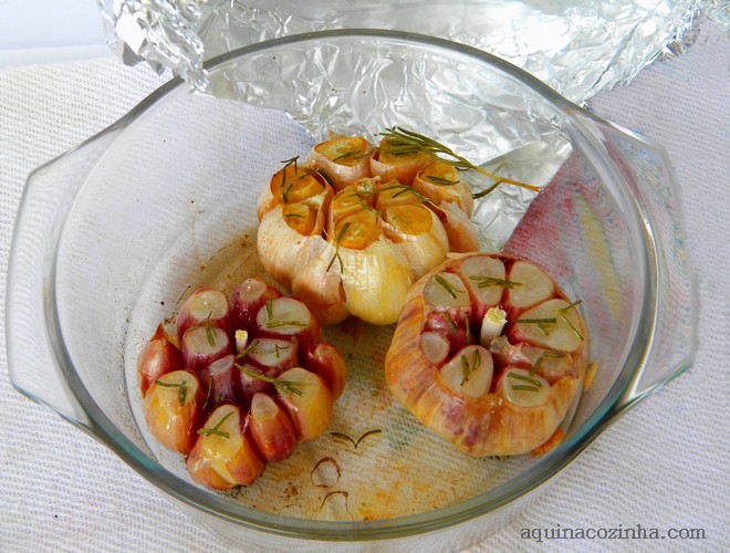 Taí uma coisa para fazer enquanto você está fazendo muitos assados: Alho Assado. Lembre sempre de quando for ligar o forno enrolar umas cabeças de alho em papel alumínio e colocar junto no forno. Assim você terá um alho delicioso que você pode usar em receitas de massas, em patês, antepastos e outras coisas. Ou você pode usá-lo para decorar pratos prontos, fica muito lindo e também para acompanhar churrasco e carne assada.