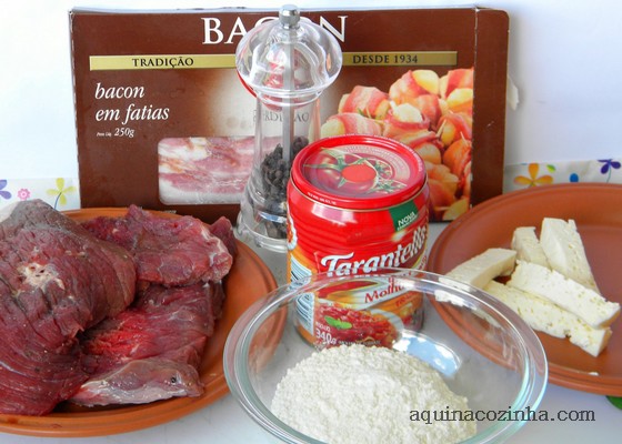Abra cada bife e coloque um palito de queijo passado na farinha de trigo e meia fatia de bacon em cima dele. Enrole cada bife (bem justinho) e prenda com palitos ou amarre com cordão.