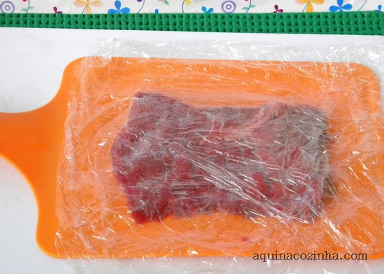 Coloque o bife em uma tábua de carne cubra com um pedaço de plástico (papel filme) e bata nele para deixá-lo mais fino e mais mole. Tempere cada um com a pimenta do reino e o sal.