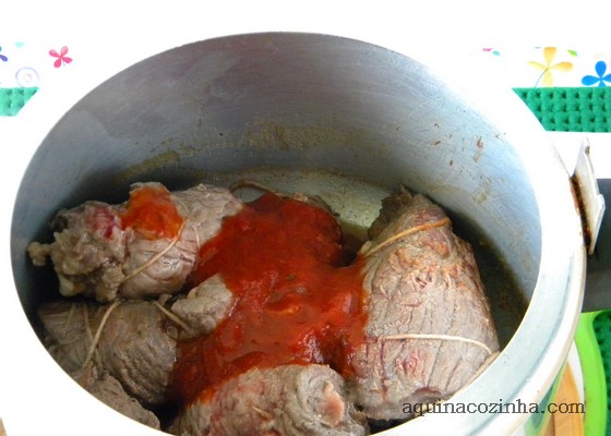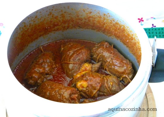 Coloque o óleo na panela de pressão e esquente, quando tiver quente junte os bifes enrolados e frite-os, de todos os lados. Quando tiver dourado acrescente o molho de tomate e a água. Feche a panela e deixe pegar pressão. Quando a panela começar a chiar, baixe o fogo e marque 40 minutos. Depois tire a pressão da panela e espete os bifes com um garfo, se tiver macio já está bom. Se você achar que ainda está duro, feche a panela e coloque no fogo mais um pouco.
