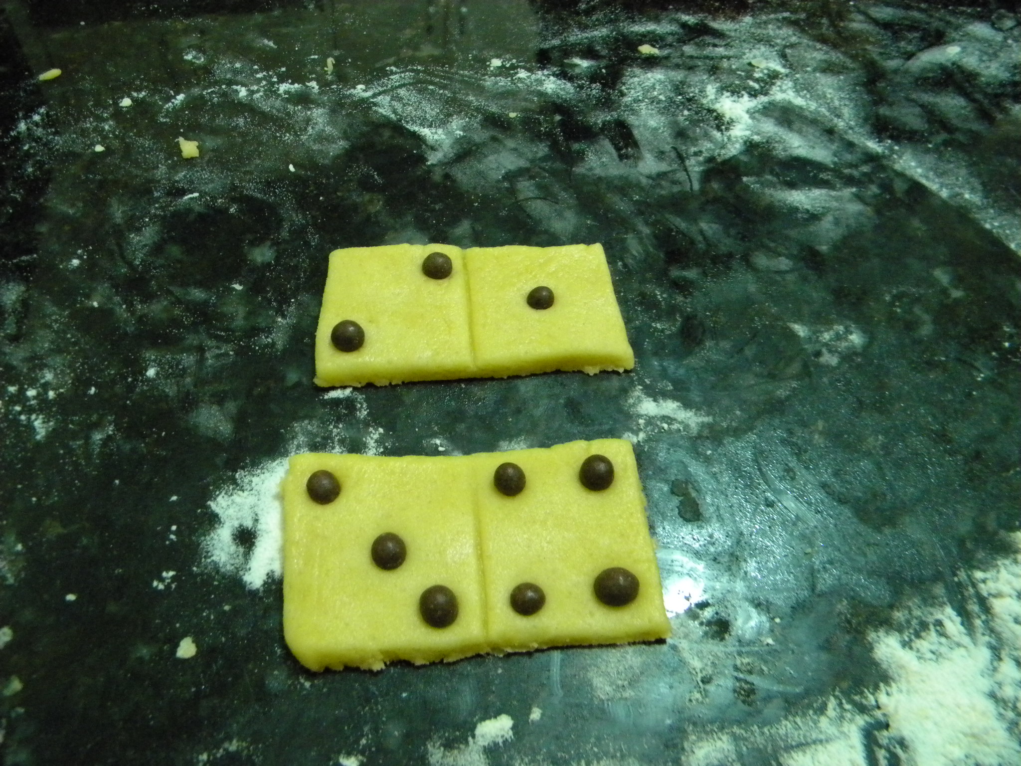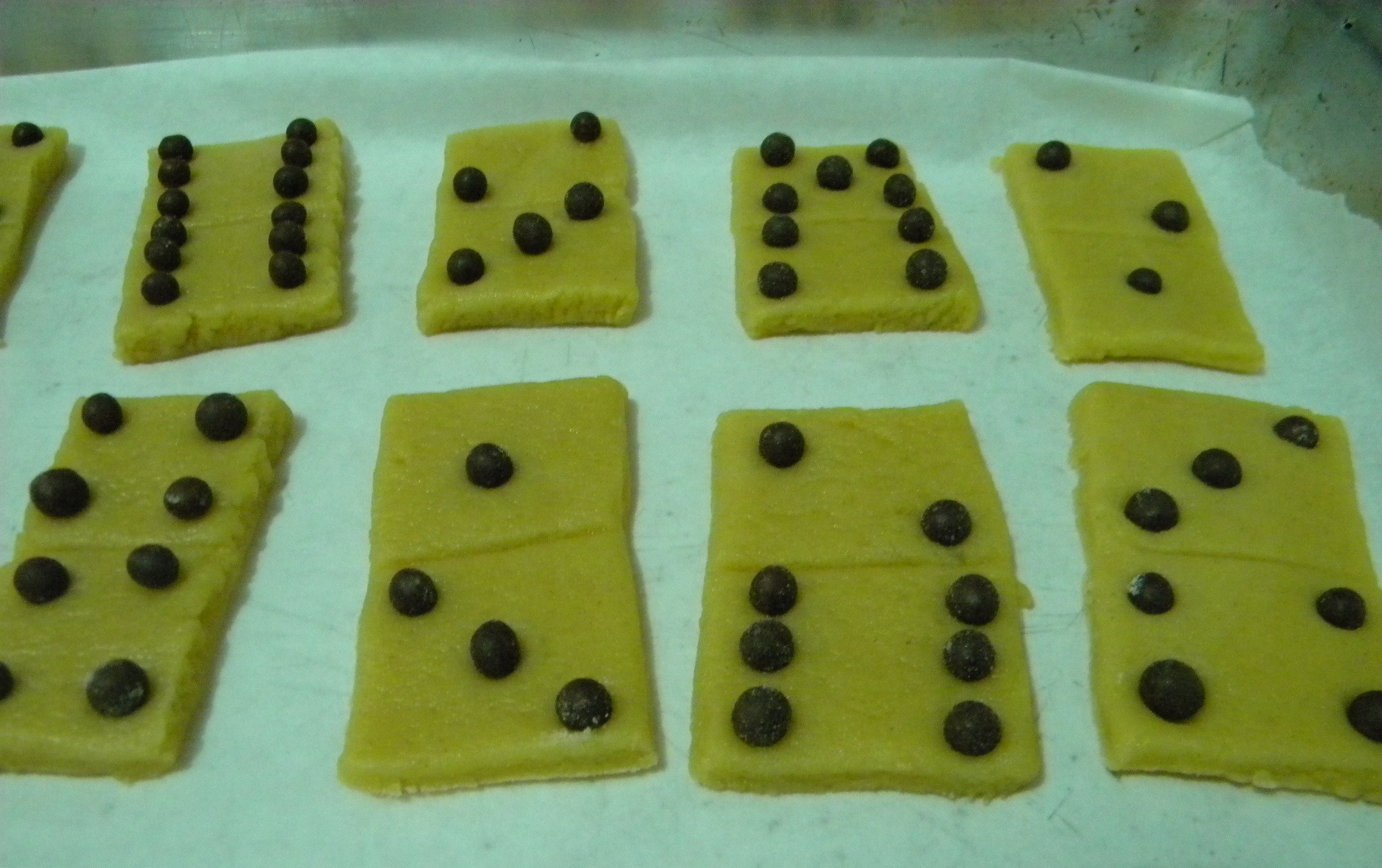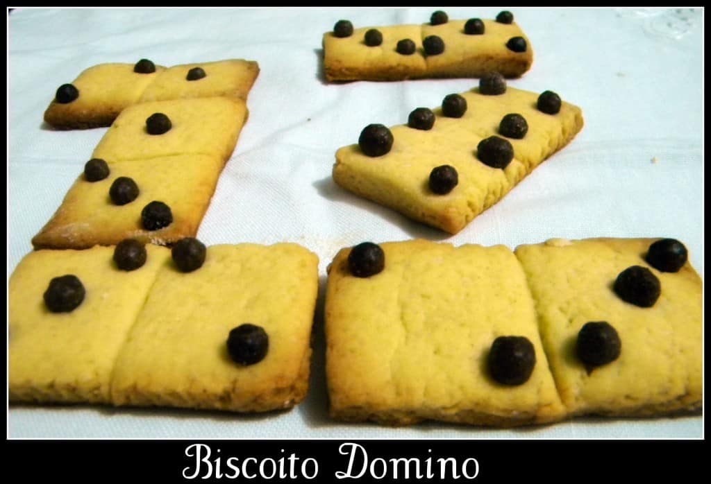 Abri a massa com um rolo e cortei retângulos com uma faca mesmo, do tamanho das peças do dominó de verdade. Com as costas da faca marquei bem no meio dos retângulos, formando dois quadrados. Usei confeitos de chocolate em forma de bolinhas para preencher os quadrados, como no dominó. Coloquei em uma forma forrada com papel manteiga e levei ao forno. Cuidado, pois ele assa bem rápido. Depois é só deixar esfriar para começar a brincadeira.