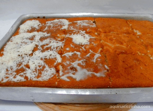 Fure todo o bolo com um palito enquanto ele ainda estiver quente e já corte em pedaços (mas não tire da forma). Molhe com a calda. Espalhe por todo o bolo de maneira uniforme (se quiser mais úmido acrescente mais leite). Deixe esfriar. Depois retire da assadeira e coloque em uma recipiente com tampa e leve à geladeira.