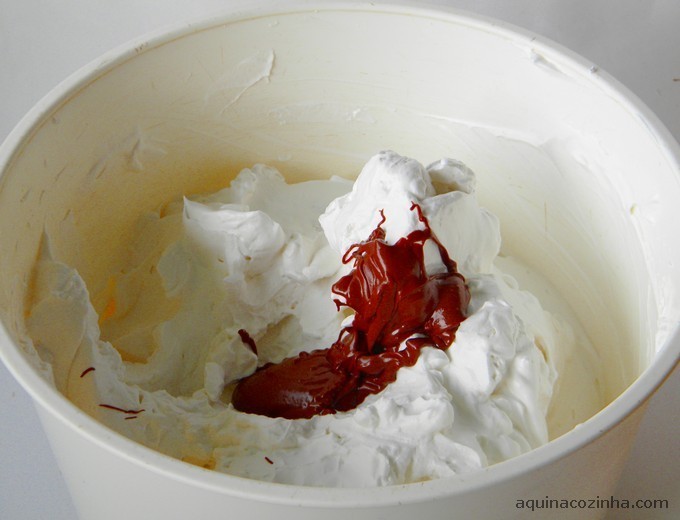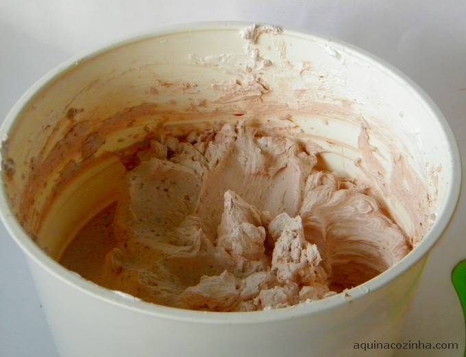 Coloque na geladeira as caixinhas de chantilly e quando tiver muito gelada, coloque na batedeira e bata até o ponto firme. Acrescente o chocolate derretido com o creme de leite e misture bem. Se você achar que ficou duro de mais para espalhar no bolo, coloque um pouquinho de leite gelado e misture na mão mesmo, ele fica mais fácil de cobrir o bolo.