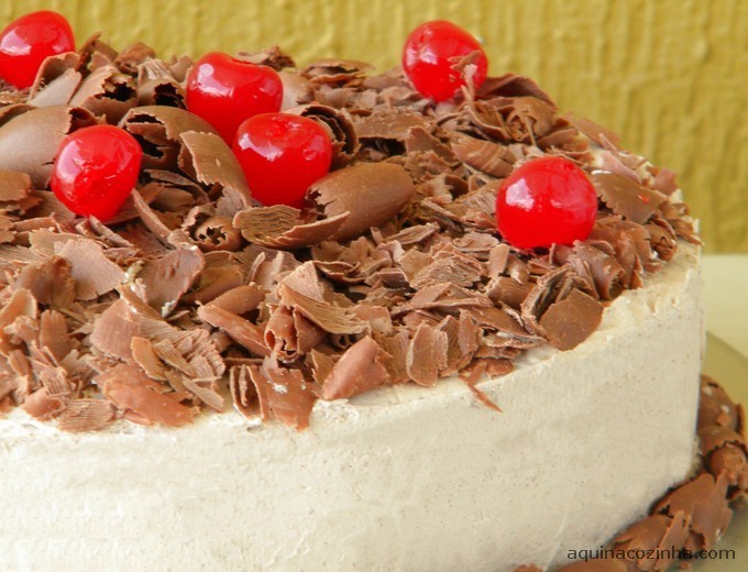 Faça dois cortes no bolo e aí você vai ficar com três partes de massa. Coloque uma das partes do bolo em uma tábua de bolo ou bandeja e umedeça com a calda. Espalhe metade do recheio e se quiser pedacinhos de chocolate, nozes, cerejas ao marasquino, damasco picado, etc. Eu fiz só com o recheio. Coloque a outra parte do bolo e repita a operação. Molhe com a calda e espalhe o recheio de trufa. Coloque a última parte do bolo e umedeça novamente. Eu gosto de terminar o bolo com a parte do fundo do bolo porque fica mais retinho. Espalhe a cobertura por cima do bolo. Para alisar, passe uma espátula na água quente e vá alisando o chantilly. A espátula quente vai deixando o chantilly mais liso. Enfeite com as raspas de chocolate e o que você mais quiser (morangos, cerejas, etc…). Leve para a geladeira.