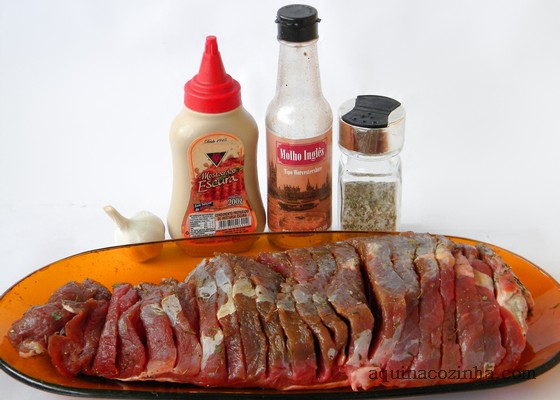 No dia anterior faça cortes na carne sem separar as camadas. Coloque a carne em um saco e acrescente o alho, o sal de ervas, a mostarda, o molho inglês e o sal. Feche o saco e massageie a carne com esse tempero. Deixe a carne nesse tempero de um dia para o outro dentro da geladeira.