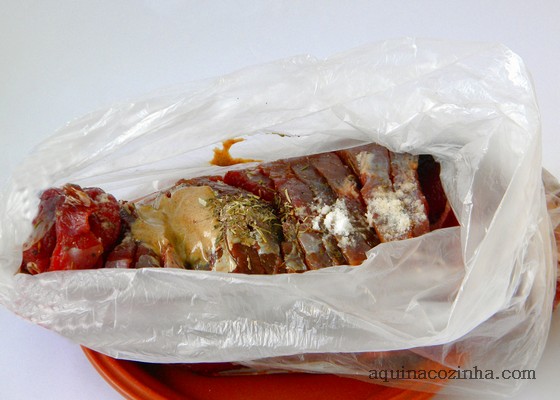 No dia seguinte retire a carne do saco e coloque em uma forma untada com manteiga. Cubra com papel alumínio e leve ao forno médio por 1 hora. Retire o papel alumínio, besunte a manteiga por cima da carne e deixe dourar por uns 20 a 30 minutos.