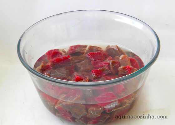 Corte a carne do sol em cubos não muito pequenos e deixe de molho na água. Se a carne estiver muito salgada deixe à noite de molho e só use a carne de manhã (troque a água algumas vezes). Se a carne não for muito salgada, lave bem ela em água corrente para retirar um pouco do sal e deixe de molho em água limpa por pelo menos 1 hora.