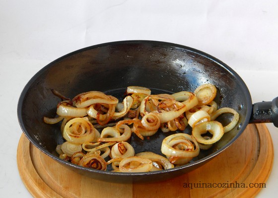 Coloque um pouco de óleo em uma frigideira e frite as rodelas de cebola. Quando estiver dourada polvilhe um pouco de sal e retire do fogo. Reserve.