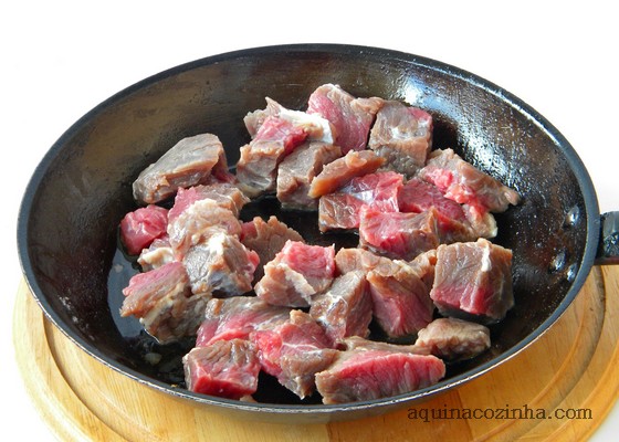 Na frigideira que você fritou a cebola coloque porções da carne bem escorrida e deixe fritar. Primeiro ela vai juntar água e depois seca e começa a dourar. O segredo aqui é não fritar muito, senão ela fica dura. Frite toda a carne e reserve.
