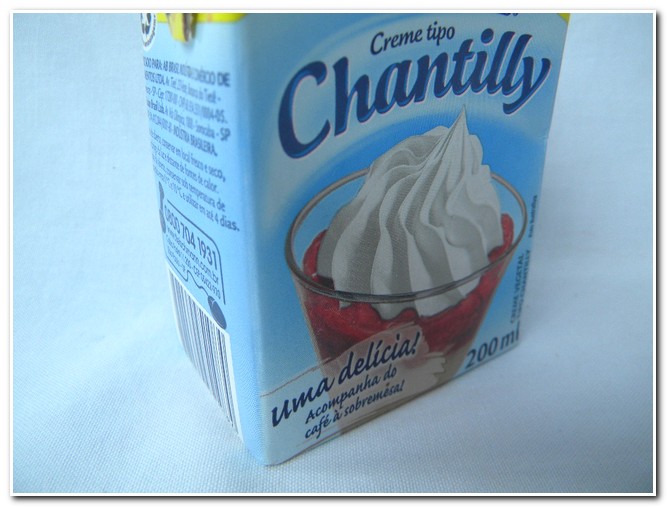- Eu fiz este chantilly que vende em caixinhas. Tem de várias marcas. É só deixar a caixinha gelar bem e depois coloque o líquido na batedeira e bata até o ponto de chantilly.