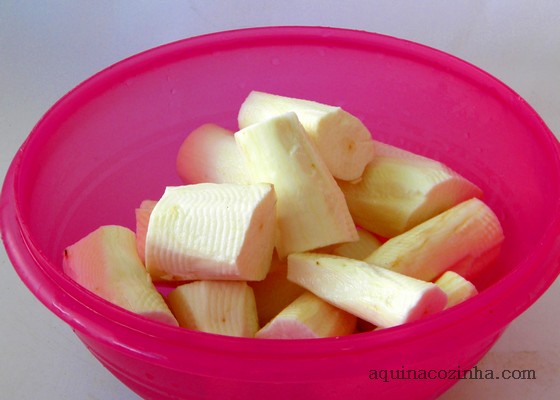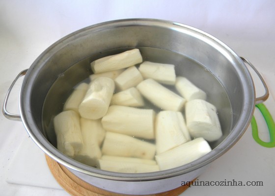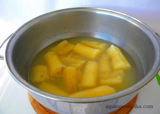- Coloque uma panela no fogo e quando a água estiver fervendo coloque a macaxeira. Cubra a macaxeira totalmente com a água, se alguma parte ficar para fora da água ela não cozinha direito.