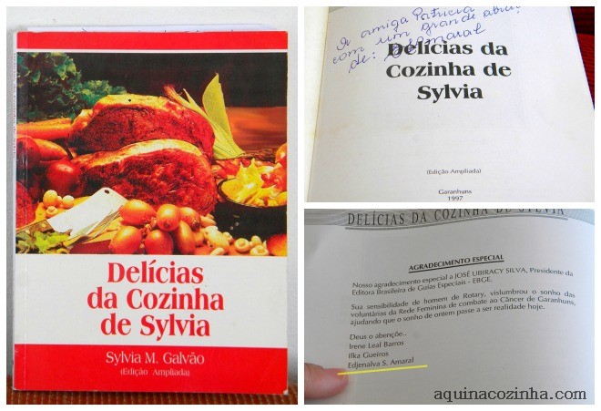 No dia que estive com D. Edjenalva e que ela fez os Biscoitos de Noz Moscada (ou Rosquinhas Fritas) ela me presenteou com esse livro “Delícias da Cozinha de Sylvia” que é um livro culinário daqui de Garanhuns. Eu não conhecia esse livro. Essa é a última edição dele, de 1997, é a terceira edição ampliada.
