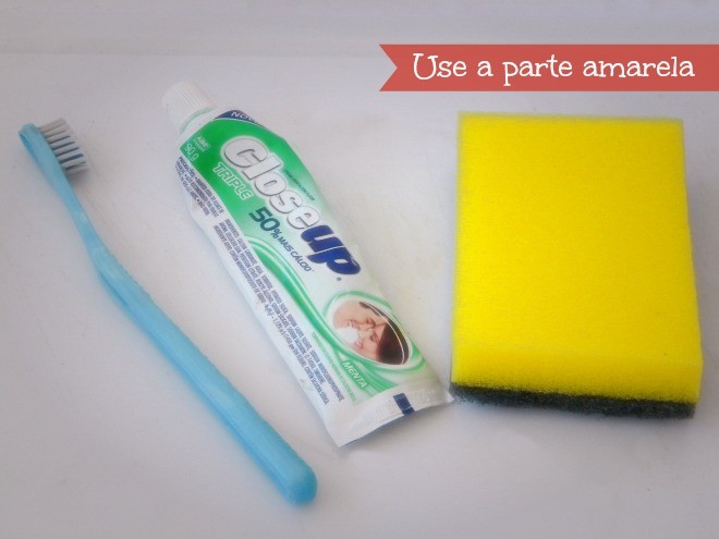 Coloque a pasta de dentes na escova úmida e comece a esfregar o objeto com certa força. Em algumas partes que não tenha muito detalhe use a bucha (a parte amarela para não correr o risco de riscar). Faça do mesmo jeito, coloque pasta na bucha úmida e esfregue. Depois basta lavar com água corrente até sair toda a pasta de dentes e secar muito bem. O brilho fica lindo, veja o detalhe da minha bandeja na primeira foto com o antes e depois.