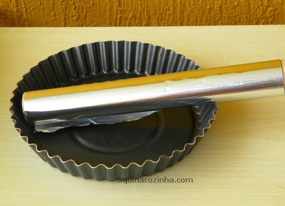 Nas formas de fundo falso, vocês podem utilizar a ajuda de um copo americano para retirar a placa, colocando a forma em cima dele.