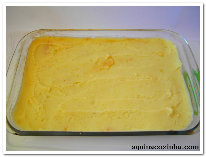 Como está nas fotas, primeiro o frango, depois o purê e por último o queijo.