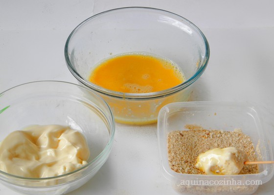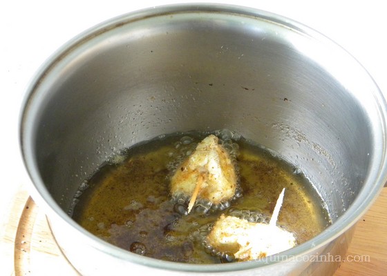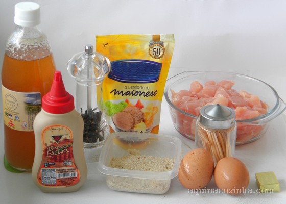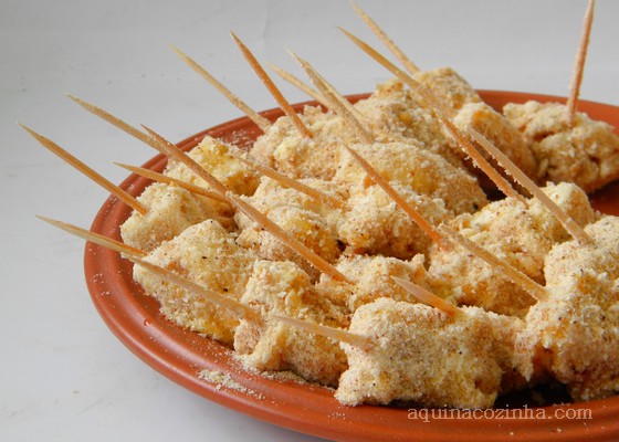- Espere esfriar e espete cada cubinho em um palito de dente. Com a ajuda de um pincel culinário passe maionese por todo o frango, passe no ovo (bata o ovo ligeiramente e coloque em um potinho) e depois na farinha de rosca. Faça isso com todo o frango. Depois coloque o óleo em uma panela e leve para esquentar. Coloque os espetinhos para fritar. Frite de um lado até ficar dourado e depois vire do outro lado para fritar também. Escorra o espetinho e coloque sobre papel absorvente. Sirva quente acompanhado de um molhinho. A minha sugestão é essa: