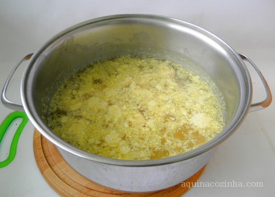 Não jogue fora o caldo onde você cozinhou o frango, guarde na geladeira, ou congele e depois use para fazer sopa, cozinhar arroz, fazer a massa da coxinha e outras coisinhas.