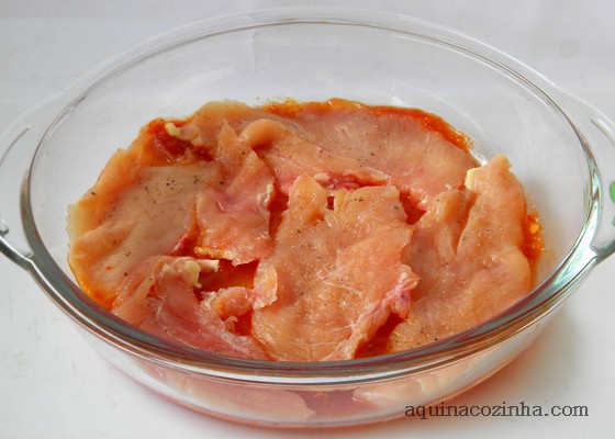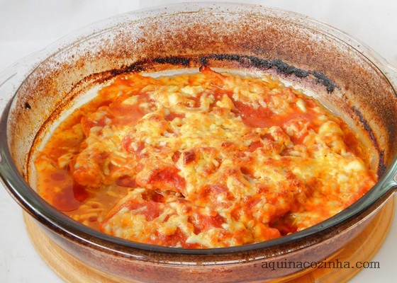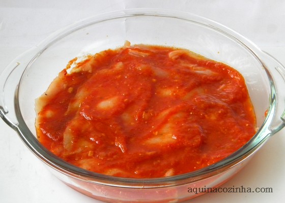 - Como colocamos o frango cru no molho e depois no forno, ele VAI JUNTAR ÁGUA, mas nada que vá atrapalhar (veja a foto 06). Quando você colocar o queijo, ele vai derreter, se misturar com a água e com o molho de tomate e ficar delicioso.