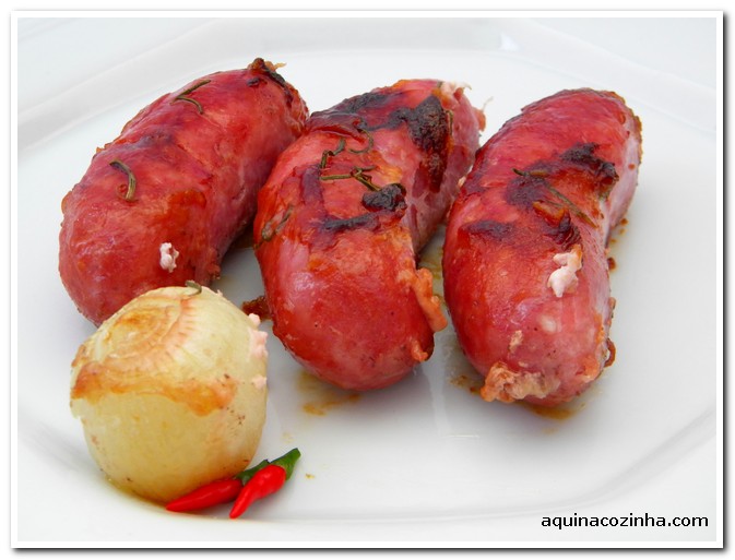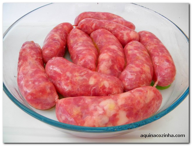 Eu resolvi fazer com uma linguiça que eu tinha no freezer, própria para churrasco, era uma linguiça fresca, tipo Toscana. E fazer na brasa em apartamento não dá. Então, foi para o forno e ficou sensacional, sem exagero.