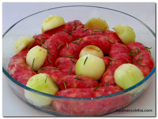 Unte uma forma refratária com o óleo, arrume as linguiças e as cebolas descascadas. Despeje o vinho sobre as linguiças e as cebolas. Polvilhe o sal e o alecrim, mas tire o cabinho, use só as folhas. Leve ao forno médio até dourar.