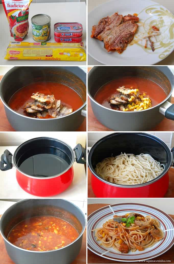 Quem nunca comeu macarrão com sardinha, ou macarrão com salsicha que atire a primeira pedra. Claro que não é uma receita sofisticada, mas é uma receita que salva a gente, por ser rápida de fazer.