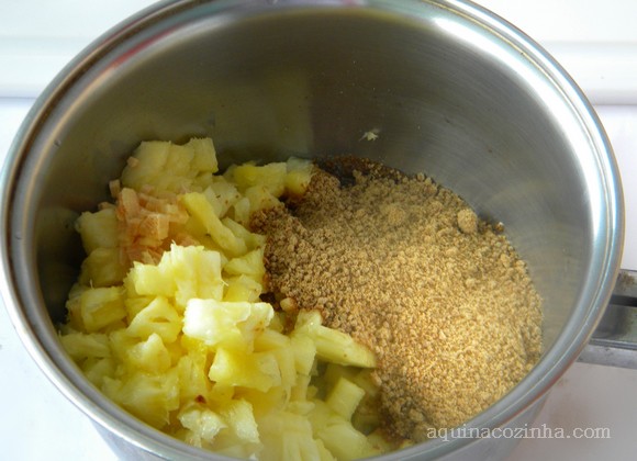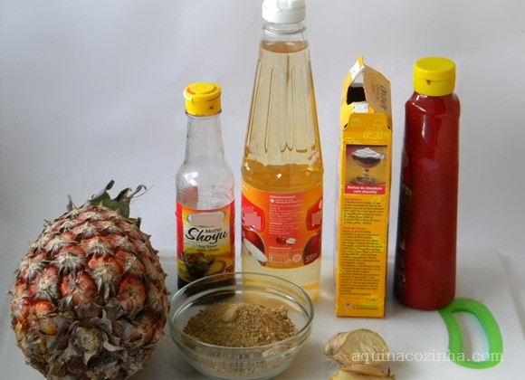 Coloque em uma panela o abacaxi picado bem pequeno com o gengibre que também tem que ser cortado bem miudinho. Acrescente o açúcar mascavo e a água. Deixe ferver por uns 5 minutos e durante esse tempo retire a espuma que vai se formando. Após esse tempo acrescente o vinagre, o ketchup e o shoyu. Deixe cozinhar mais uns 5 minutos. Por último dissolva a maisena em uma colher (de sopa) de água fria e junte ao molho, mexendo. Depois que levantar fervura novamente, conte 1 minuto de pode desligar, o molho está pronto.