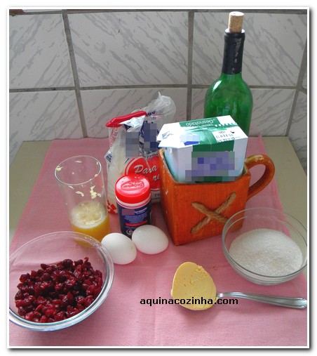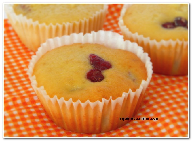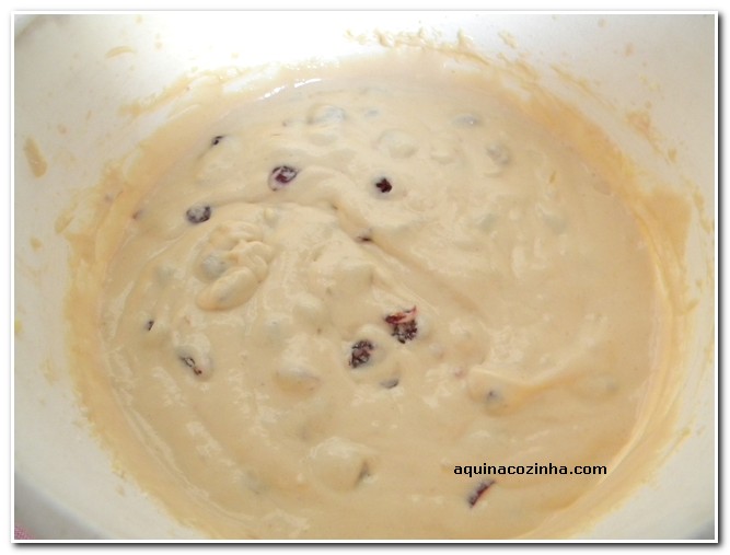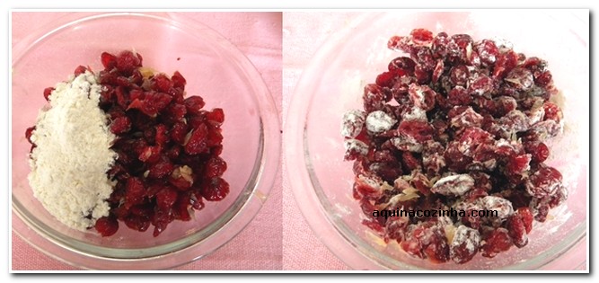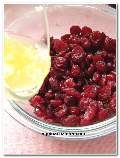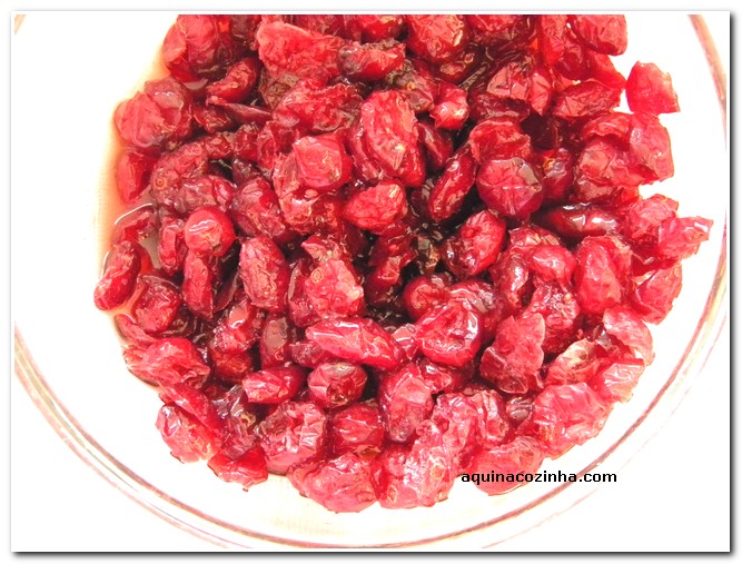 Aqui, usei o cranberry seco, a frutinha fresca, nunca vi, nem comi, eu só ouço falar. A seca é um tipo de passa, a textura é bem parecida com a passa de uva, mas o sabor é um pouco mais ácido, mas é um ácido, meio docinho, não sei se dá para entender.