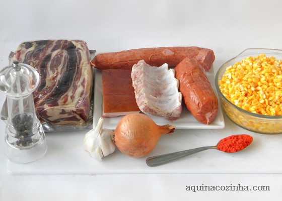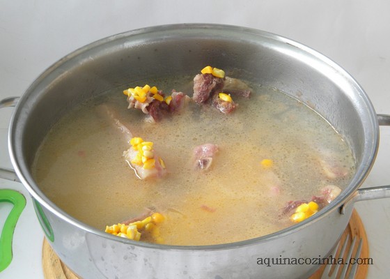 - Se você fizer na panela de pressão o tempo de preparo cai para menos da metade. Mas, como só tenho panela de pressão caseira, ela não cabe essa quantidade. Mas, dá para você pelo menos cozinhar as carnes e o milho e depois colocar em uma panela maior e continuar, isso já diminuirá muito o tempo.