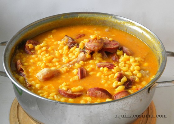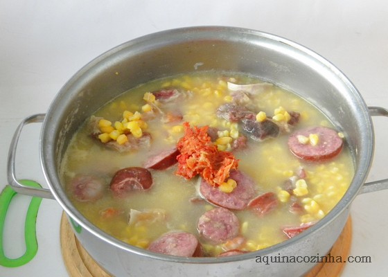 Corte a linguiça calabresa e o paio em rodelas e depois que o milho estiver macio junte-os na panela e mexa bem. Acrescente a mistura da cebola e do alho e acrescente mais água quente se precisar. Deixe cozinhar até o caldo engrossar um pouco (cerca de 30 minutos), mas mexa de vez enquando para não grudar no fundo. Quando engrossar um pouco, já está bom.