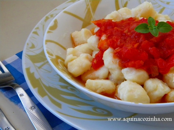 - Pode só esquentar o molho de tomate, misturar os nhoques cozidos, depois colocar no prato, polvilhar queijo ralado, enfeitar com folhas de manjericão e servir (como eu fiz).