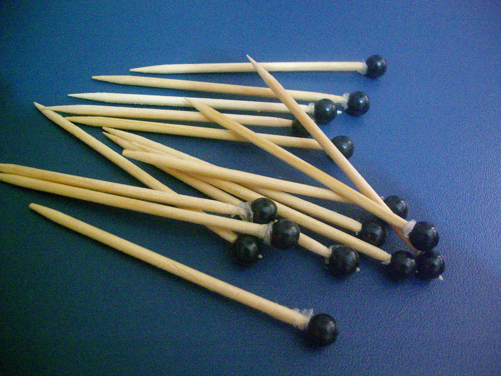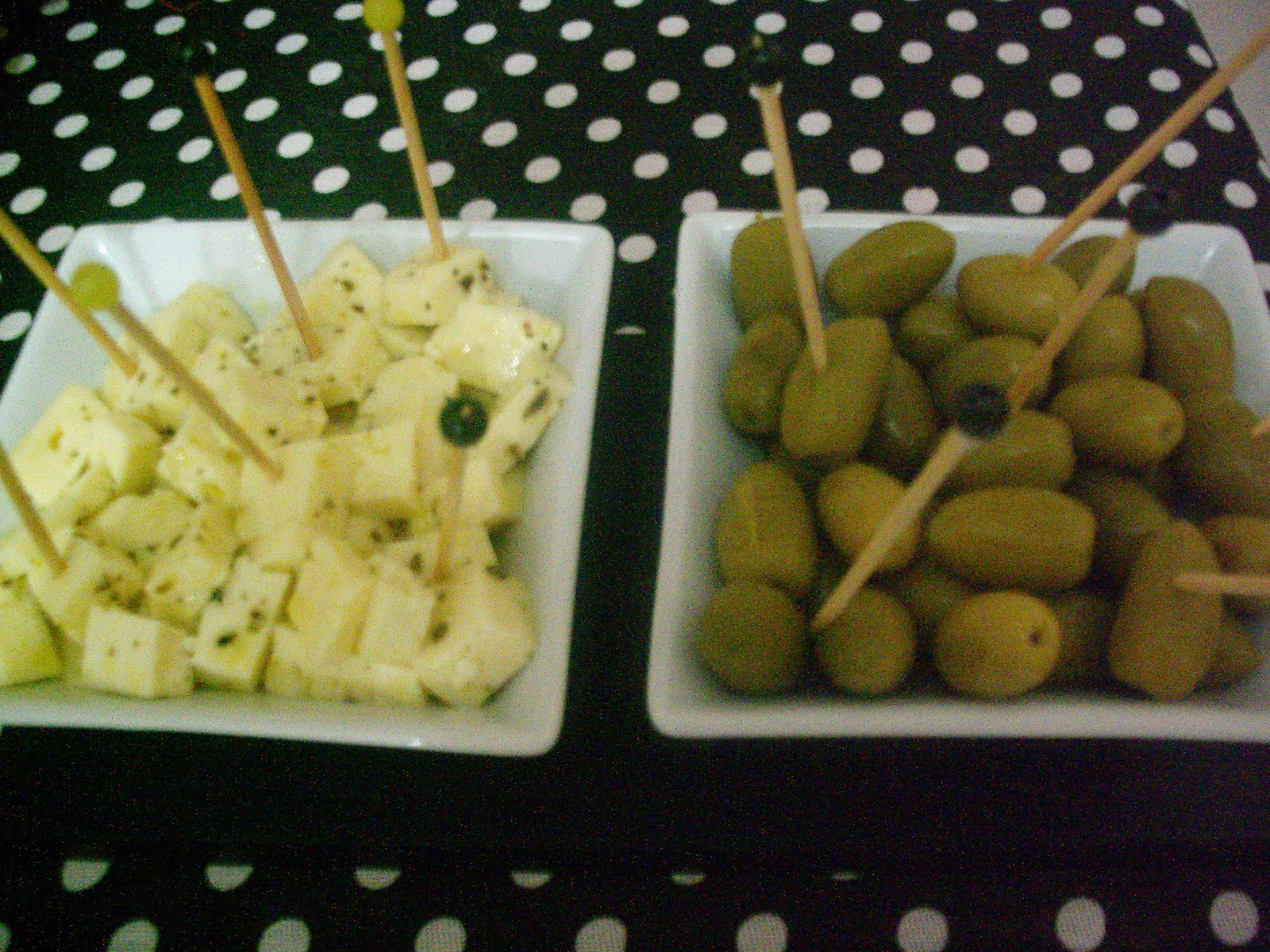 Eu usei os palitinhos para servir as azeitonas e o queijo temperado.