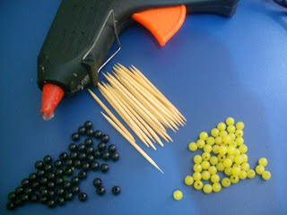 Brincadeiras à parte, eu queria uns palitinhos que combinassem com a decoração, então comprei umas miçangas na cor da festa e mãos à obra.