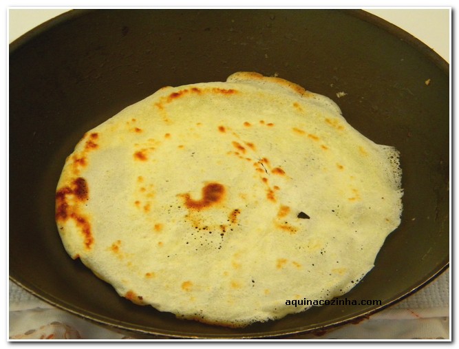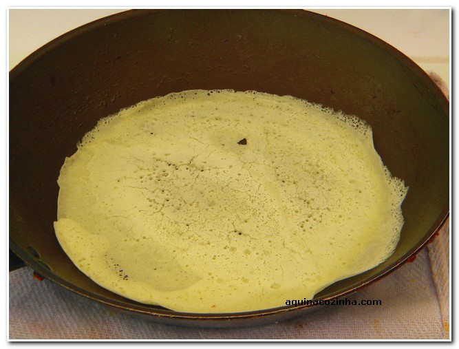 Coloque os ingredientes no liquidificador e bata bem para misturar. Aqueça uma frigideira untada com óleo. Despeje uma concha de massa na frigideira aquecida e vá virando até o líquido forrar todo o fundo da frigideira. Aqui tem um segredo: Coloque pouco líquido e vá espalhando, quanto mais fininha ela fica, mais gostosa. Deixe secar a massa como na foto 3 e com a ajuda de uma espátula reta, vire e deixe dourar um pouco do outro lado também. Vá colocando uma sobre a outra em um prato. Logo que a panqueca sai do fogo ela fica meio quebradiça, deixe ela descansando um pouco e só depois recheie e dobre.