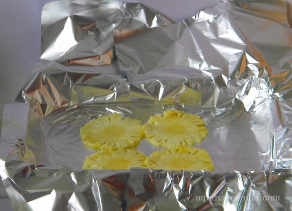 No dia seguinte, forre uma assadeira com papel alumínio e unte com manteiga. Coloque rodelas de abacaxi, polvilhe um pouco de açúcar no abacaxi e o pernil por cima das rodelas. Cubra o pernil com outras rodelas de abacaxi, colocando pedacinhos de manteiga em cima das rodelas, polvilhando açúcar sobre elas (vai caramelar). Despeje o restante dos temperos que ficou no saco e feche muito bem o papel alumínio. Leve ao forno médio (uns 180 graus) por 2 horas e meia. Abra o papel alumínio, espete o pernil e veja se já está macio, se não estiver feche o papel alumínio e deixe assando um pouco mais. Se já estiver macio, deixe o papel alumínio aberto, pincele um pouco de manteiga e leve ao forno mais um tempo para dourar. O meu ficou cerca de 30 minutos.