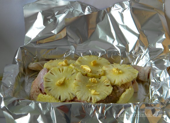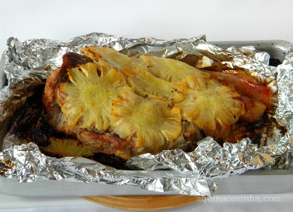 Eu fiz com pernil desossado e servi com o molho que coloquei ontem aqui no blog, o Molho de Abacaxi para Assados (tipo chinês) e combinou perfeitamente. O agridoce do molho deu um toque super especial para a carne. Minha dica é sempre servir a carne acompanhada com um molho (esse ou outro), fica muito bom.