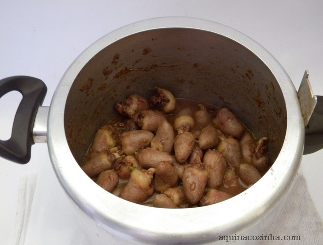 - Se juntar muita água e o coraçãozinho já tiver cozido, retire um pouco da água antes de voltar a panela para o fogo para secar a água e fritar os corações.