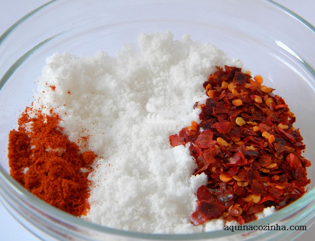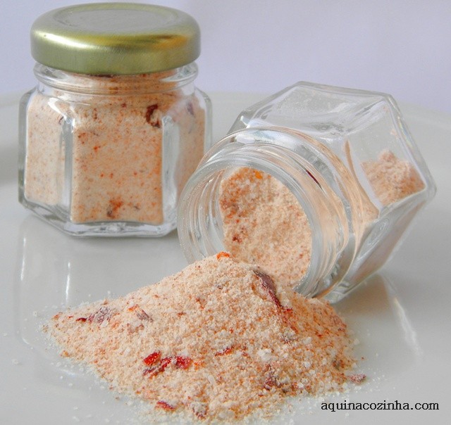 Vocês sabem que eu, nesse fim de ano, estou fazendo vários tipos de sal temperado. Na verdade estou fazendo vários presentinhos caseiros. E estava com a ideia de fazer um sal temperado picante que desse para eu temperar carnes assadas. Fui testando as quantidades e cheguei neste, que para mim ficou ótimo. Está com picância média então, se você gosta mais matador, é só acrescentar mais pimenta caiena em pó.