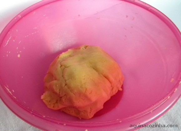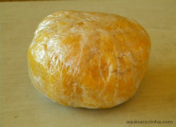 - Coloque todos os ingredientes em uma tigela e amasse até obter uma massa. Não sove a massa, é só misturar. Se você sovar muito, corre o risco dela escorrer na forma quando assar. Embrulhe em papel filme ou alumínio e deixe na geladeira por pelo menos 30 minutos.