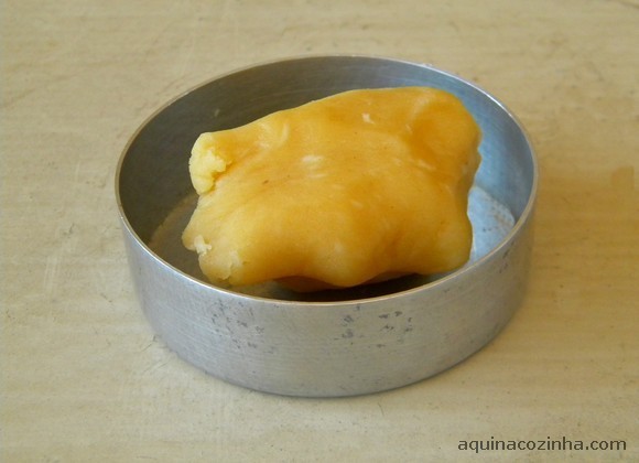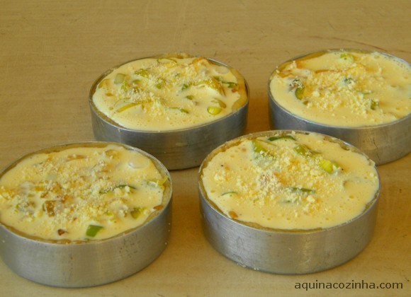 - Pegue pequenas porções de massa e vá abrindo com os dedos, até forrar toda a forminha (não precisa untar a forma), foto 07. Coloque uma colherada do recheio, despeje a cobertura por cima, polvilhe queijo ralado e leve ao forno médio (180 graus) e preaquecido por uns 20 minutos ou até dourar.