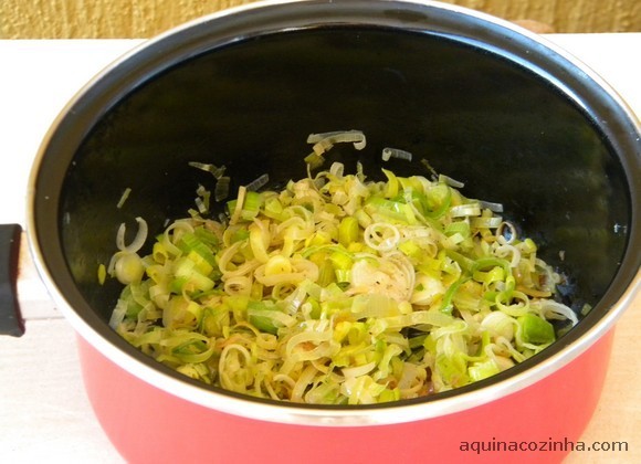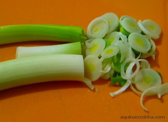 Eu fiz, para aproveitar que eu, nas últimas semanas, tenho encontrado alho poró na feira daqui, o que não é muito comum. Aliás, nem no supermercado eu encontrava alho poró. Veja a receita: