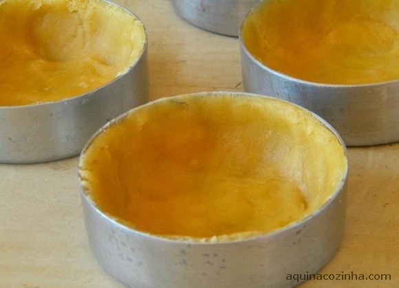 - Pegue pequenas porções de massa e vá abrindo com os dedos, até forrar toda a forminha (não precisa untar a forma), foto 07. Coloque uma colherada do recheio, despeje a cobertura por cima, polvilhe queijo ralado e leve ao forno médio (180 graus) e preaquecido por uns 20 minutos ou até dourar.
