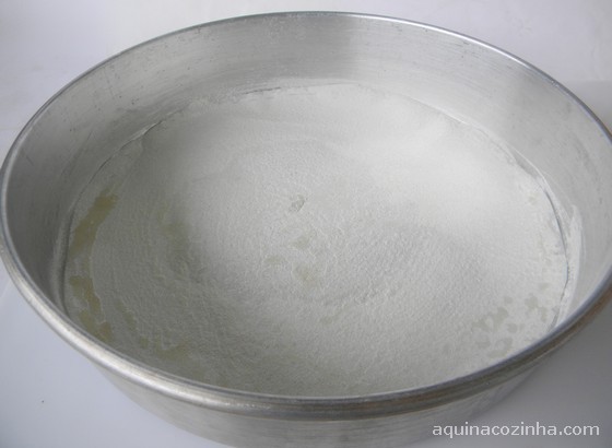Corte um pedaço de papel manteiga e forre o fundo de uma assadeira (foto 5). Você vai untar e enfarinhar apenas o fundo, não unte as laterais. Aprendi essa dica com o Beltrame e achei ótima. Assim, evita do bolo baixar nas laterais.