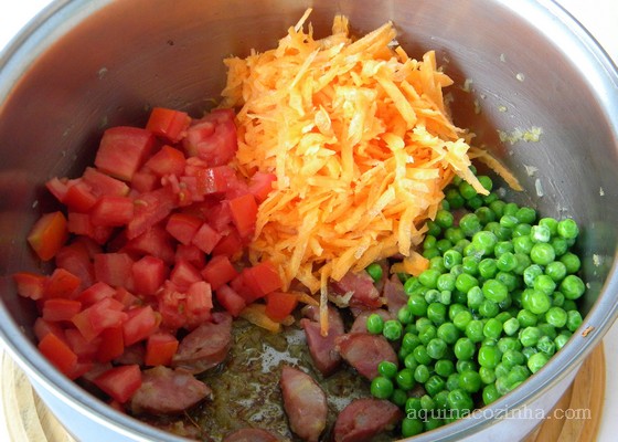 Em uma panela coloque a manteiga e a cebola e frite até a cebola dourar. Acrescente a calabresa e frite um pouco mais. Junte o tomate, a cenoura, a ervilha e a água e deixe cozinhar alguns minutos, até a ervilha amolecer. Misture o arroz cozido, mexa bem. Experimente e veja se precisa de um pouquinho de sal. Deixe o fogo bem baixo e misture um pouco mais. Sirva quente.