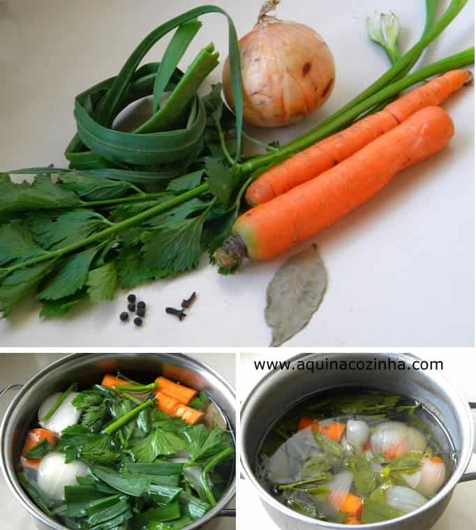 - Como eu já disse faça seu caldo com os legumes que você gosta e prefere, mas tente usar sempre cebola, cenoura e salsão que são a base da receita do caldo clássico, mas se quiser usar tomate, alho, salsinha, etc…