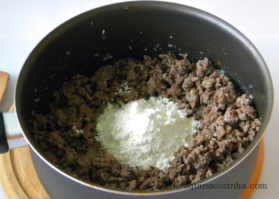 Esquente a manteiga em uma panela e acrescente a carne moída, mexa bem. Deixe a água que vai se formar na carne, secar. Daí frite um pouquinho. Acrescente o alho e a cebola e frite mais. Junte a pimenta do reino e o sal. Acrescente o leite e a farinha de trigo. Misture muito bem. Vai se formar uma bola de carne, mas com calma e espalhando a massa, cozinhe por alguns minutinhos. Retire a massa do fogo e deixe esfriar. Depois da massa fria, modele croquetes.