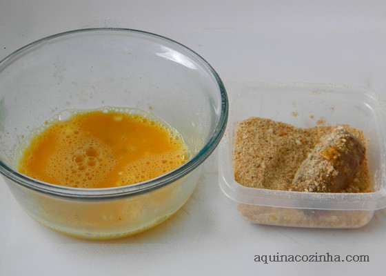 - Eu gosto de colocar o ovo batido e a farinha de rosca em recipientes pequenos, assim não preciso colocar a mão dentro da vasilha para empanar, só balanço o recipiente.