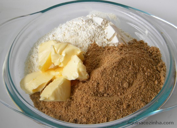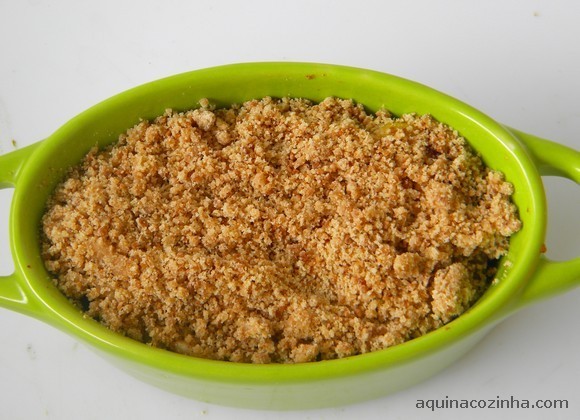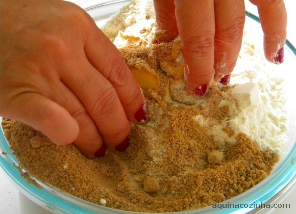 Farofa – Coloque todos os ingredientes em um recipiente e com as pontas dos dedos (foto 4 ) vá misturando os ingredientes até formar uma farofa. Não amasse muito para não virar uma pasta. Polvilhe essa farofinha sobre as frutas e leve ao forno médio preaquecido (180 graus) por mais ou menos 30 minutos, ou até que a farofinha esteja dourada. Sirva a seguir, ainda quente.