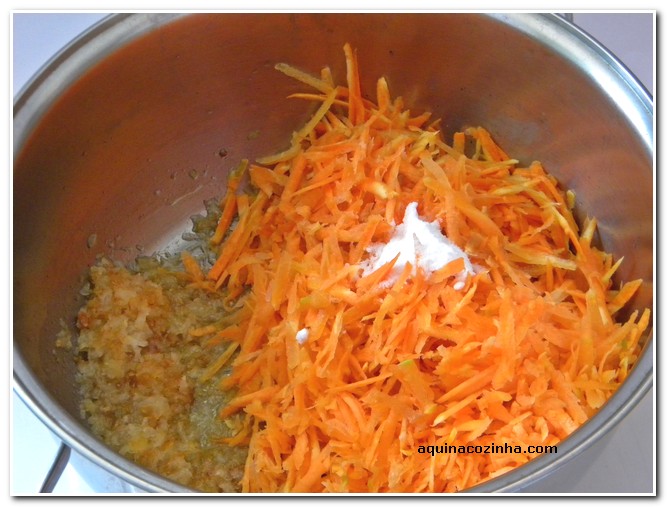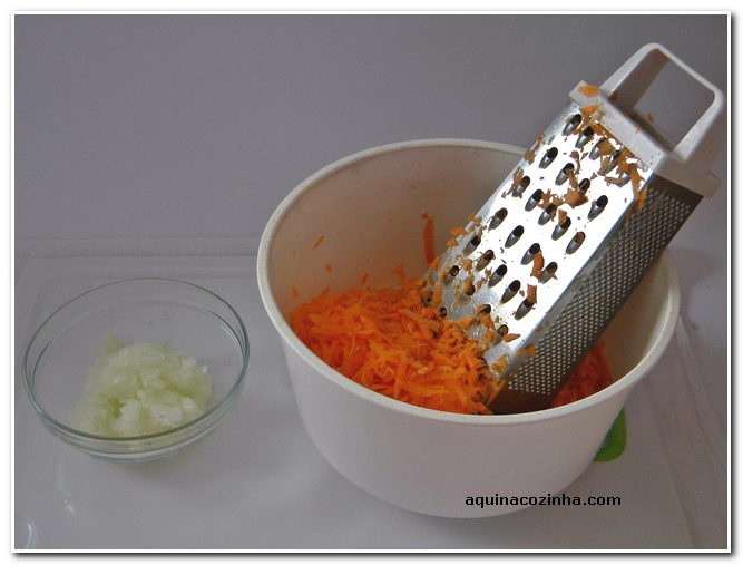 - Rale a cebola e a cenoura separadamente. Coloque a manteiga em um a panela e leve ao fogo com a cebola ralada. Deixe dourar até ficar como na foto 3. Depois junte a cenoura, o sal e mexa. Leve ao fogo até murchar um pouco a cenoura, não deixe cozinhar muito. Retire do fogo e acrescente a farinha de mandioca. Misture bem. Leve ao fogo novamente só para esquentar. Prontinho.