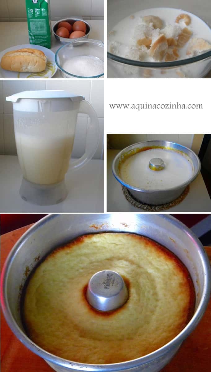 - Coloque o pãozinho picado de molho no leite por uns 10 minutos. Depois coloque no liquidificador junto com os ovos, o açúcar e a baunilha. Bata bem até o pãozinho desmanchar todo. Coloque esse líquido na forma caramelizada e leve ao forno ou ao fogão em banho-maria.
