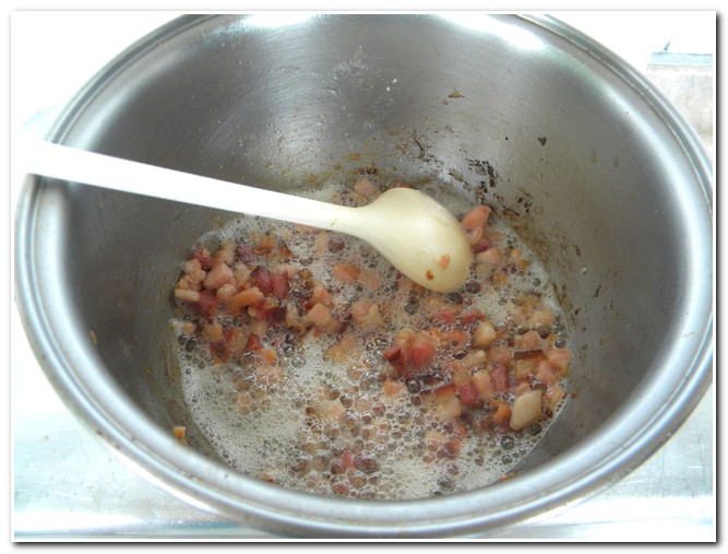 Coloque o bacon em uma panela com um fio de óleo para fritar. Depois dele frito acrescente a cebola picada e deixe fritar também. Só depois da cebola frita coloque o repolho ralado. Deixe a panela aberta e mexa de vez em quando. Se ver, que tem necessidade acrescente um pouquinho de água (mas é bem pouquinho mesmo, pois não é para ficar com água). Assim que o repolho estiver cozido acrescente o vinagre e o sal e deixe mais um minutinho no fogo. Agora é só servir.